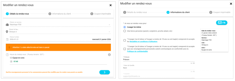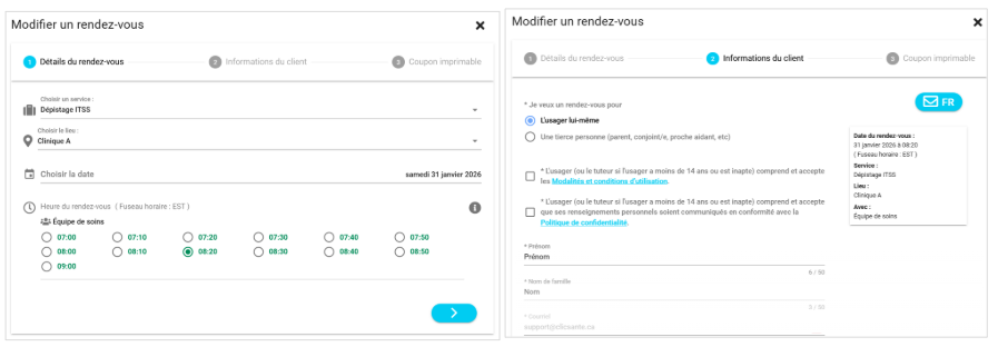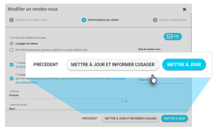 L'usager recevra un SMS et/ou un courriel confirmant la mise à jour dans quelques minutes, à condition que ses informations de contact (cellulaire et/ou courriel) soient inscrites dans le rendez-vous.