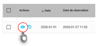 - Localisez le rendez-vous à modifier et cliquez sur l’icône en forme d’œil située dans la colonne Actions. Les détails du rendez-vous s’afficheront automatiquement.
