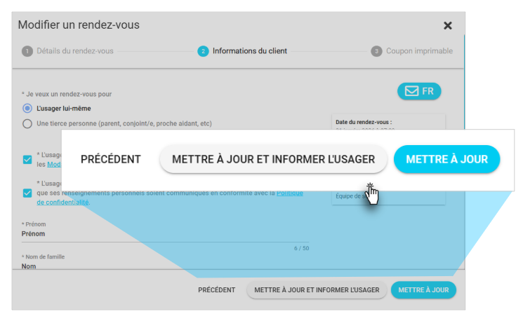 L'usager recevra un SMS et/ou un courriel confirmant la mise à jour dans quelques minutes, à condition que ses informations de contact (cellulaire et/ou courriel) soient inscrites dans le rendez-vous.