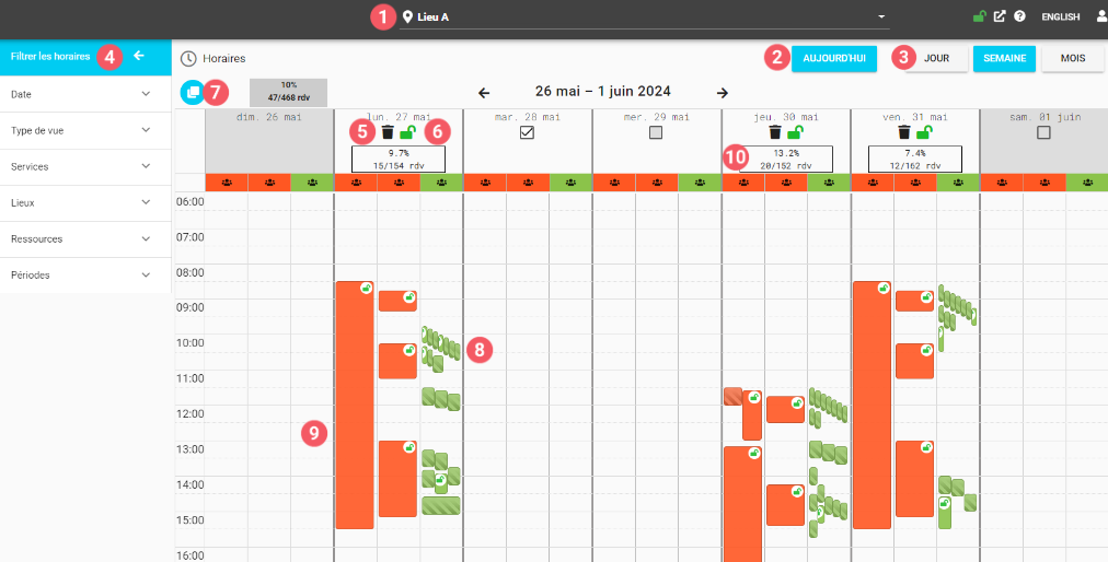 - Information des rendez-vous réservés versus rendez-vous disponibles de la journée